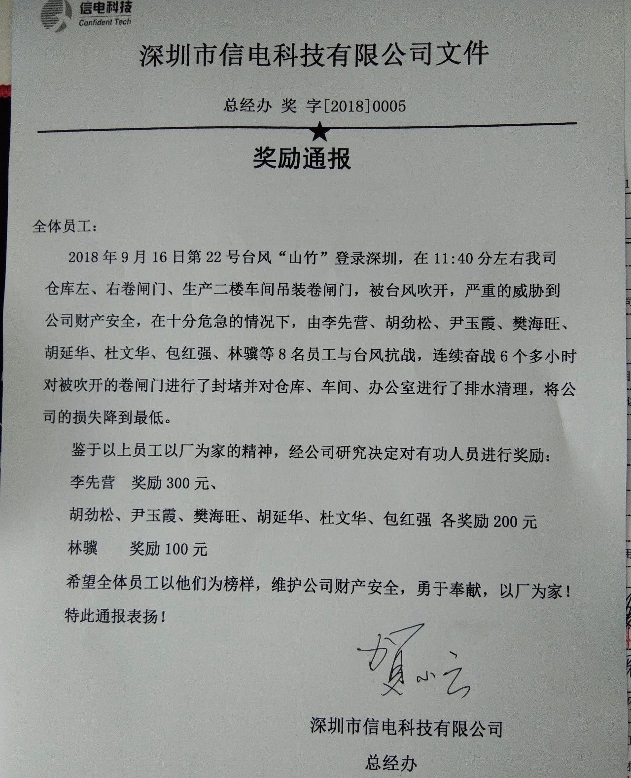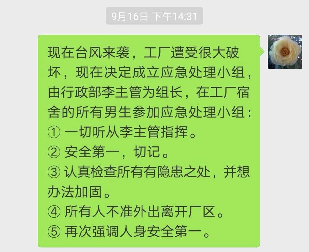 經(jīng)過大家的努力搶險,連續(xù)奮戰(zhàn)6個多小時,極大減小了臺風對公司造成的損失。非常感謝這些抗臺風勇士們,為此公司總經(jīng)辦還給出通報表揚和獎勵。
