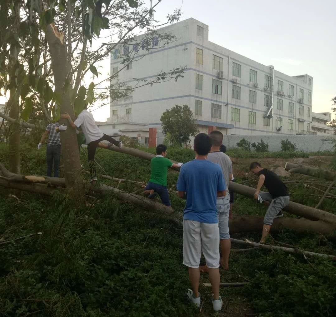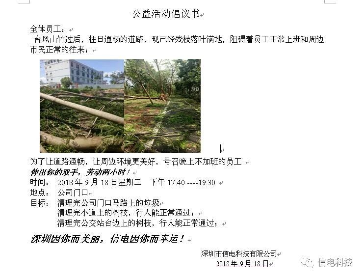 由于道路被刮倒的大樹所堵,廠區(qū)內(nèi)一片狼籍,臺風過后,公司又號召員工參加志愿者,對廠區(qū)和道路進行清理和災后重建,并貼出“公益活動倡這議書”。
