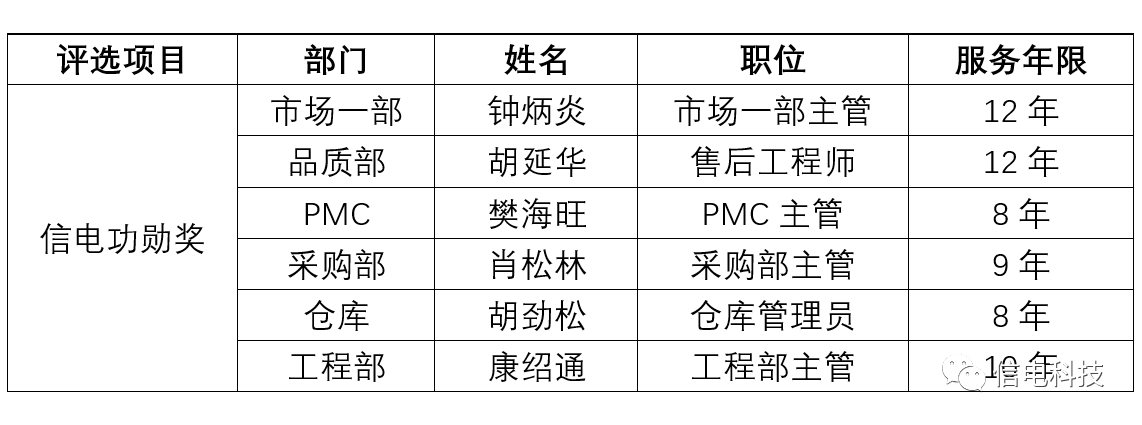 信電功勛獎授于了對公司發(fā)展作出了巨大貢獻的6名員工,他們分別是: